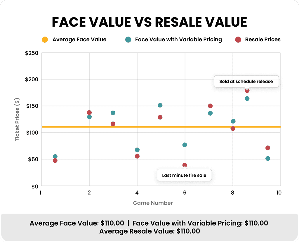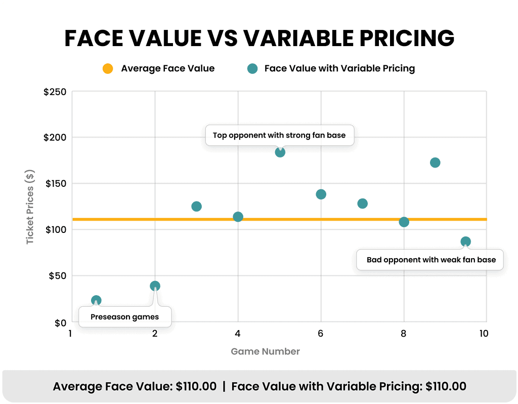 Some teams assign different face values for each game based on expected demand. You may see the best game of the season cost up to 5 times more than the worst game of the season. While variable pricing is closer to reflecting resale value than average face value, variable pricing has the same issue of being outdated since each game value is determined long before the season starts.