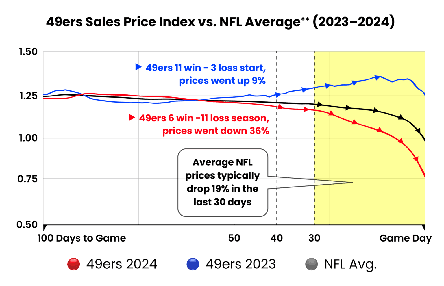 That is because NFL ticket prices typically drop quickly (19%) in the last 30 days to gameday.