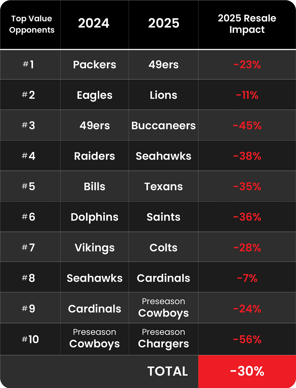 Given that away team popularity is the #1 driver of game-to-game resale value variation, resale prices are down significantly year-over-year. Coupled with two preseason games this year compared to one last year, the overall value of a 2025 Rams season ticket package diminishes more.